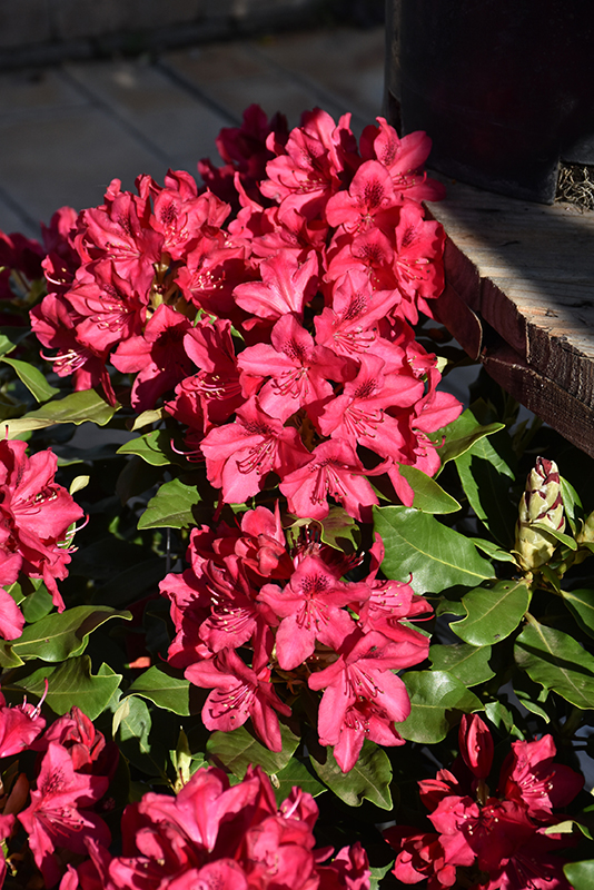 Nova Zembla Rhododendron is draped in stunning clusters of crimson trumpet-shaped flowers with dark red spots at the ends of the branches in mid spring. It has green evergreen foliage. The large narrow leaves remain green throughout the winter.