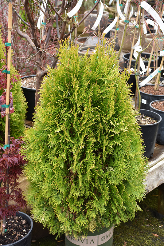Highlights® Arborvitae is primarily valued in the landscape for its distinctively pyramidal habit of growth. It has yellow evergreen foliage. The scale-like sprays of foliage turn gold in the fall, which persists throughout the winter.