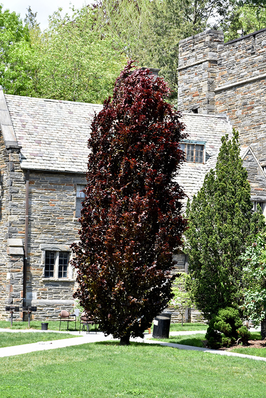 A narrowly columnar tree with deep purple crinkled foliage all season long, excellent for color, articulation or as a tall screen; quite particular about growing conditions, requires rich soil and significant moisture; a good size for the home landscape