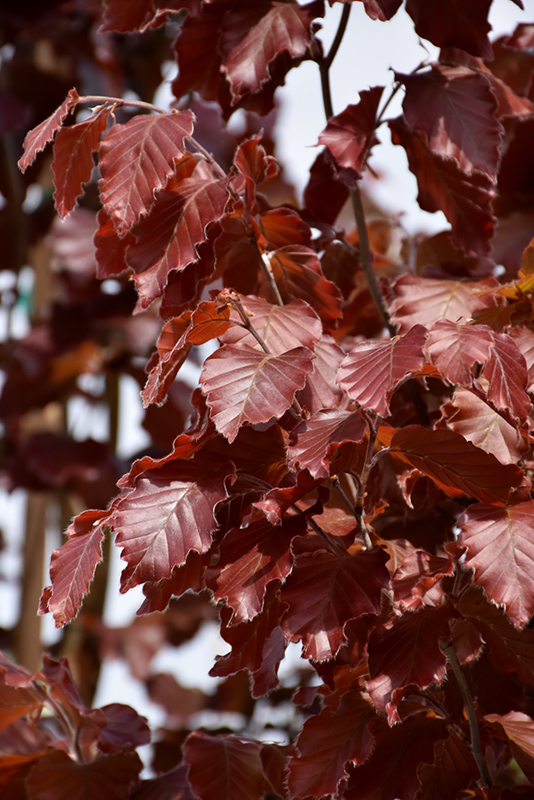 Red Obelisk Beech is primarily valued in the landscape for its rigidly columnar form. It has attractive burgundy deciduous foliage. The serrated pointy leaves are highly ornamental and turn an outstanding coppery-bronze in the fall. The smooth silver bark is extremely showy and adds significant winter interest.