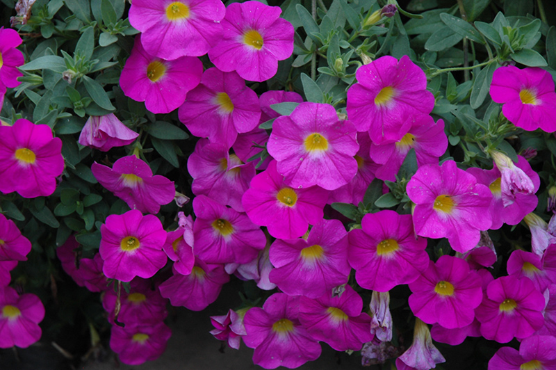 SuperCal® Pink Petchoa is blanketed in stunning pink trumpet-shaped flowers with yellow throats at the ends of the stems from mid spring to late summer. Its pointy leaves remain green in color throughout the season.