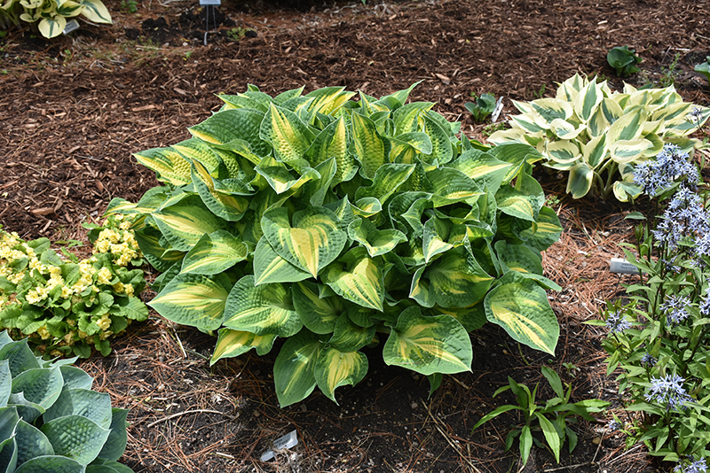 Gold leaved hosta with blue-green variegation and slight corrugation, fades to orange-gold color; provides beautiful texture and contrast to other plants; lavender spikes of flowers in early to mid-summer