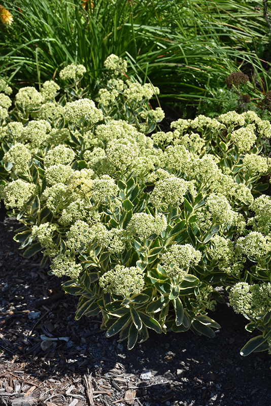 Frosted Fire Stonecrop has masses of beautiful clusters of rose flowers at the ends of the stems from late summer to late fall, which emerge from distinctive white flower buds, and which are most effective when planted in groupings. The flowers are excellent for cutting. Its attractive large succulent oval leaves remain green in color with distinctive buttery yellow edges throughout the season.