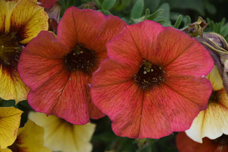 SuperCal® Premium Cinnamon Petchoa is blanketed in stunning crimson trumpet-shaped flowers with black throats at the ends of the stems from mid spring to late summer. Its pointy leaves remain green in color throughout the season.