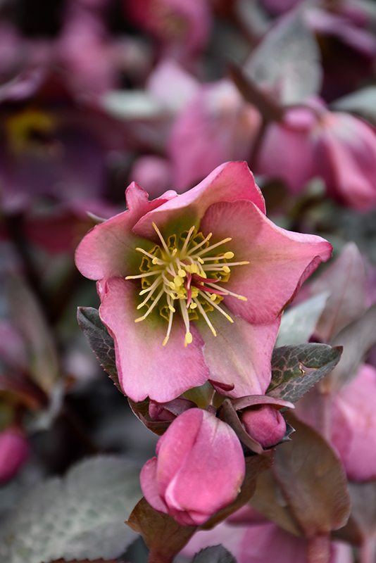 Frostkiss® Dorothy's Dawn Hellebore features showy nodding pink cup-shaped flowers with rose overtones at the ends of the stems from late winter to early spring. Its glossy oval compound leaves emerge coppery-bronze in spring, turning green in color with distinctive creamy white veins the rest of the year. The dark red stems can be quite attractive.