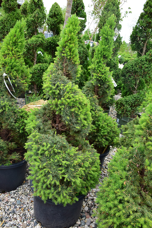 A dwarf evergreen sheared to a spiral form making a dazzling accent, requires annual pruning to keep in form; ideal as a garden accent; incredibly dense needles are very sensitive to winter burn and may need winter protection in exposed locations