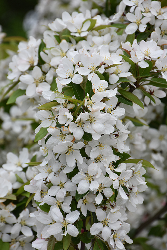 Harvest Gold Flowering Crab is covered in stunning clusters of fragrant white flowers with shell pink overtones along the branches in mid spring, which emerge from distinctive rose flower buds. The fruits are showy gold pomes carried in abundance from early fall to late winter. It has dark green deciduous foliage. The pointy leaves turn yellow in fall.